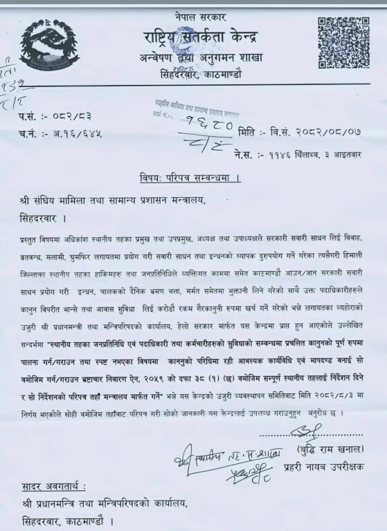 हिमाली जिल्लाका केही स्थानीय तहका हाकिम तथा जनप्रतिनिधिले व्यक्तिगत प्रयोजनका लागि सरकारी सवारीसाधन दुरुपयोग गर्दै इन्धन, चालकको दैनिक भ्रमण भत्ता (डीए), मर्मत–सम्भार लगायतमा भुक्तानी लिने गरेको उजुरीपछि संघीय मामिला तथा स्थानीय विकास मन्त्रालयले ७५३ वटै स्थानीय तहलाई परिपत्र जारी गरेको छ।