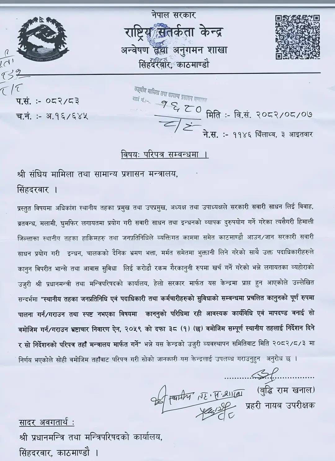 केन्द्रमा प्रधानमन्त्री तथा मन्त्रालयपरिषद्को कार्यालय ‘हेलो सरकार’ मार्फत आएका उजुरीका आधारमा मन्त्रालयलाई पत्राचार गरिएको हो। केन्द्रका प्रहरी नायब उपरीक्षक बुद्धिराम खनालद्वारा हस्ताक्षरित पत्रमा स्थानीय तहका जनप्रतिनिधि, पदाधिकारी तथा कर्मचारीका सुविधा सम्बन्धी सबै कार्य प्रचलित कानुनअनुसार गर्न तथा गराउन निर्देशन गरिएको छ। साथै स्पष्ट नभएका विषयमा कानुनी परिधिभित्र आवश्यक कार्यविधि र मापदण्ड बनाई लागू गर्न भनिएको छ।