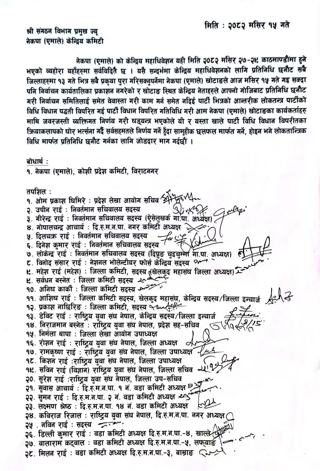 जिल्ला कमिटी, प्रदेश लेखा आयोग, वडा कमिटी, जनवर्गीय संगठन र युवा संघ–महासंघका जिम्मेवार पदाधिकारीसहित ३० भन्दा बढी नेताहरूको हस्ताक्षर रहेको यो ज्ञापनपत्रलाई स्थानीय स्तरमा ‘राजनीतिक विगुल’ का रूपमा हेरिएको छ।