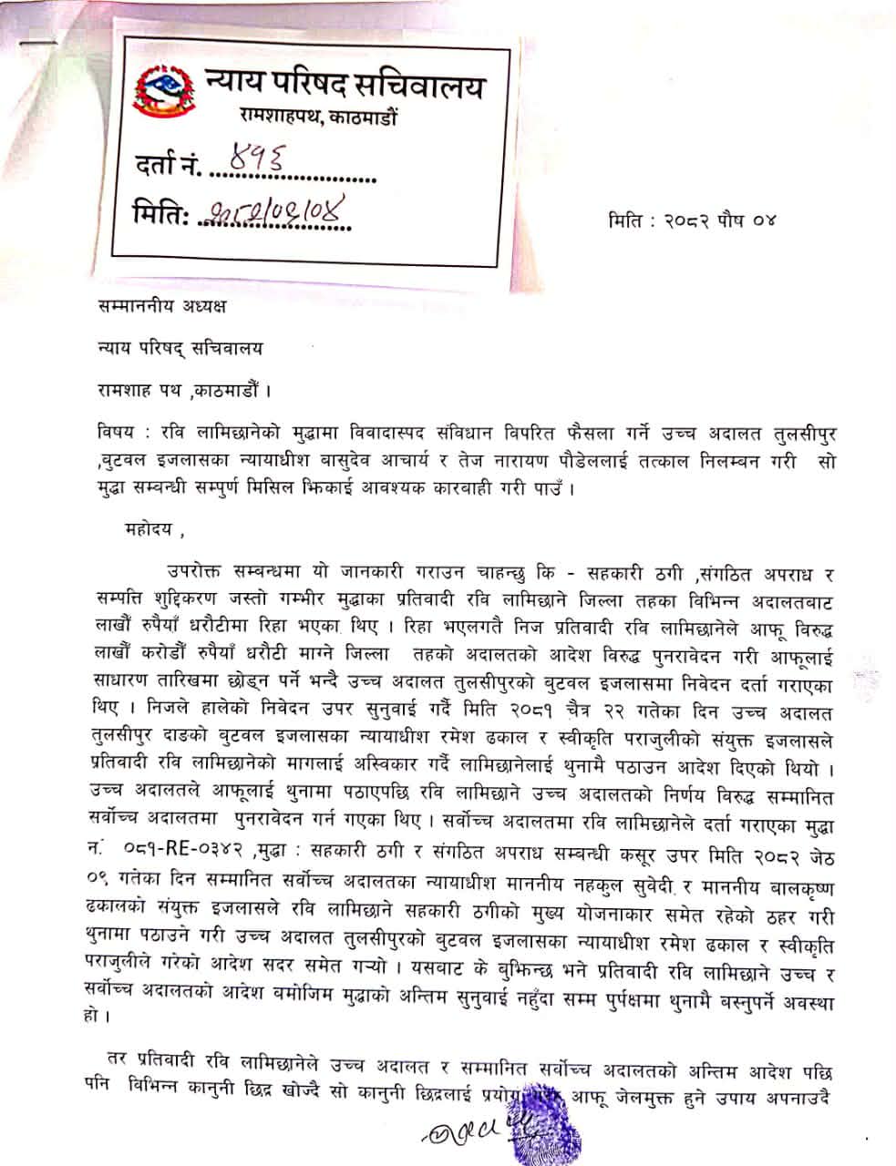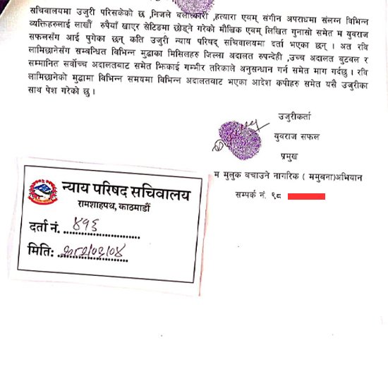 मुलुक बचाउने नागरिक अभियान का प्रमुख युवराज सफलले राष्ट्रिय स्वतन्त्र पार्टी (रास्वपा) का सभापति रवि लामिछानेको रिहाइ आदेश दिने न्यायाधीशहरूविरुद्ध कारबाहीको माग गर्दै न्याय परिषद् सचिवालयमा उजुरी दर्ता गराएका छन्।