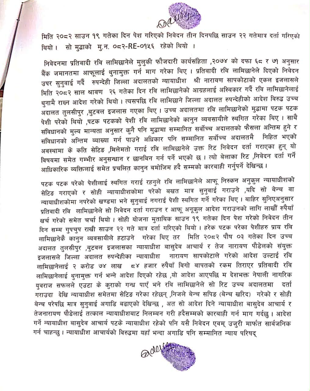 शुक्रबार दर्ता गरिएको उजुरीमा सफलले उच्च अदालत तुलसीपुर, बुटवल इजलासका न्यायाधीशद्वय बासुदेव आचार्य र तेजनारायण पौडेलाई तत्काल निलम्बन गरी हदैसम्मको कारबाही गर्न माग गरेका छन्। उजुरीमा रवि लामिछाने न्यायाधीशसँग ‘सेटिङ’ मिलाएर रिहा भएको आरोप लगाइएको छ।