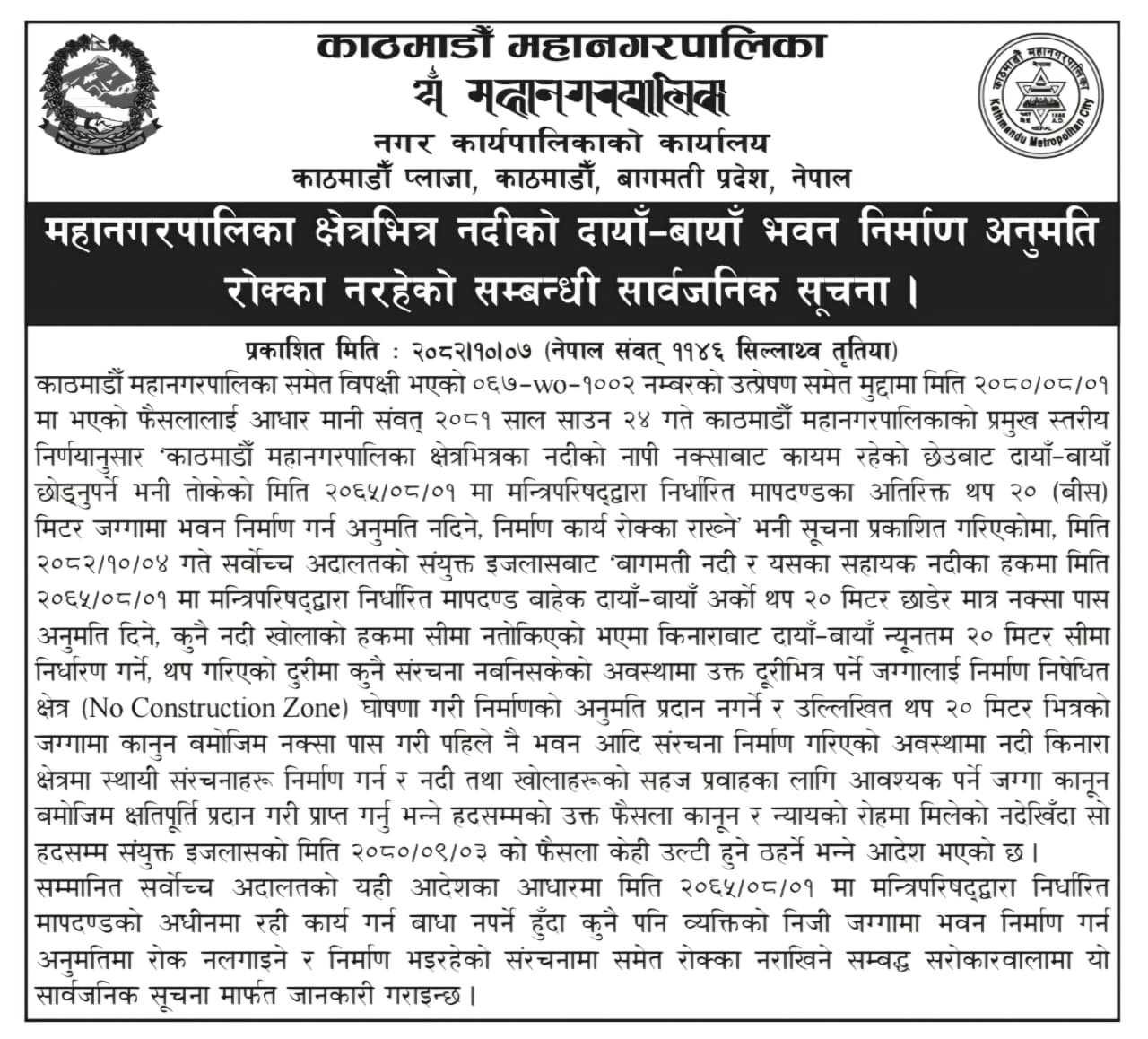 बुधबार सार्वजनिक सूचना जारी गर्दै महानगरले नदी किनारामा थप २० मिटर दायाँ–बायाँ संरचना बनाउन अब रोक नलगाइने जनाएको हो।